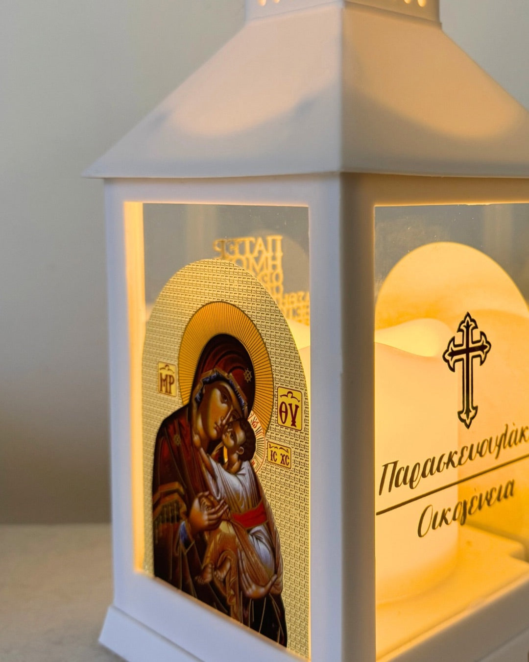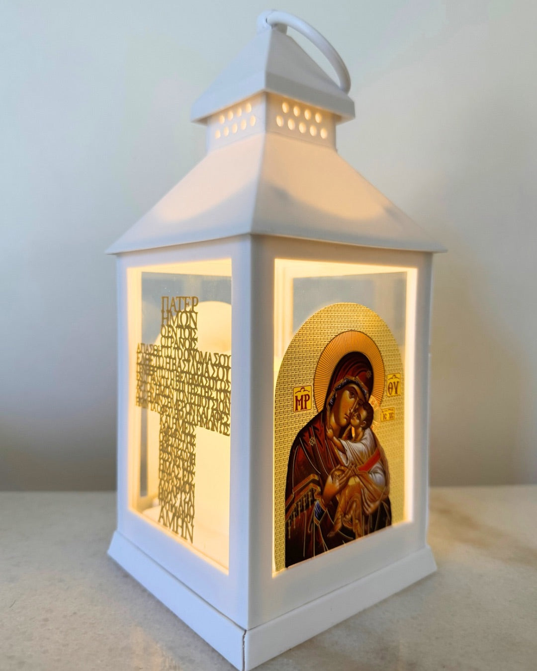 Designed with sacred imagery of Jesus and Mary, and featuring the full text of the Lord’s Prayer in Greek , our blessings Lantern serves as a peaceful reminder of God’s presence in your home. Battery-operated for easy use, this elegant piece softly glows from within and can be personalised with your family name, making it a meaningful addition to any space.